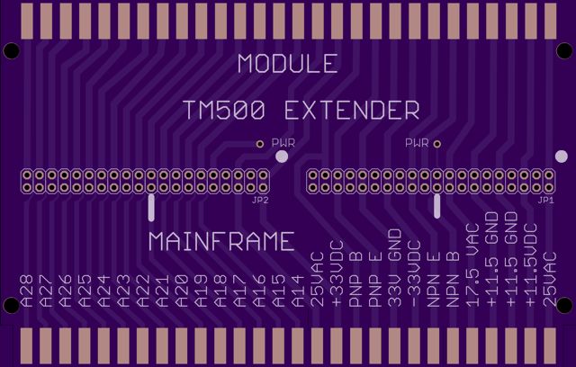 The board that I laid out has two 40 pin ribbon cable box headers on it (the layout is compatible with IDE headers that have pin 20 removed or blocked). All of the power pins on the TM500 bus use two conductors (plus Tek doubled or quadrupled most of the power pins). The other pins are signal level pin that don't carry much current. A single 28 ga ribbon wire of the appropriate length should be able to do an amp or so. There should not be any major problems running most modules.