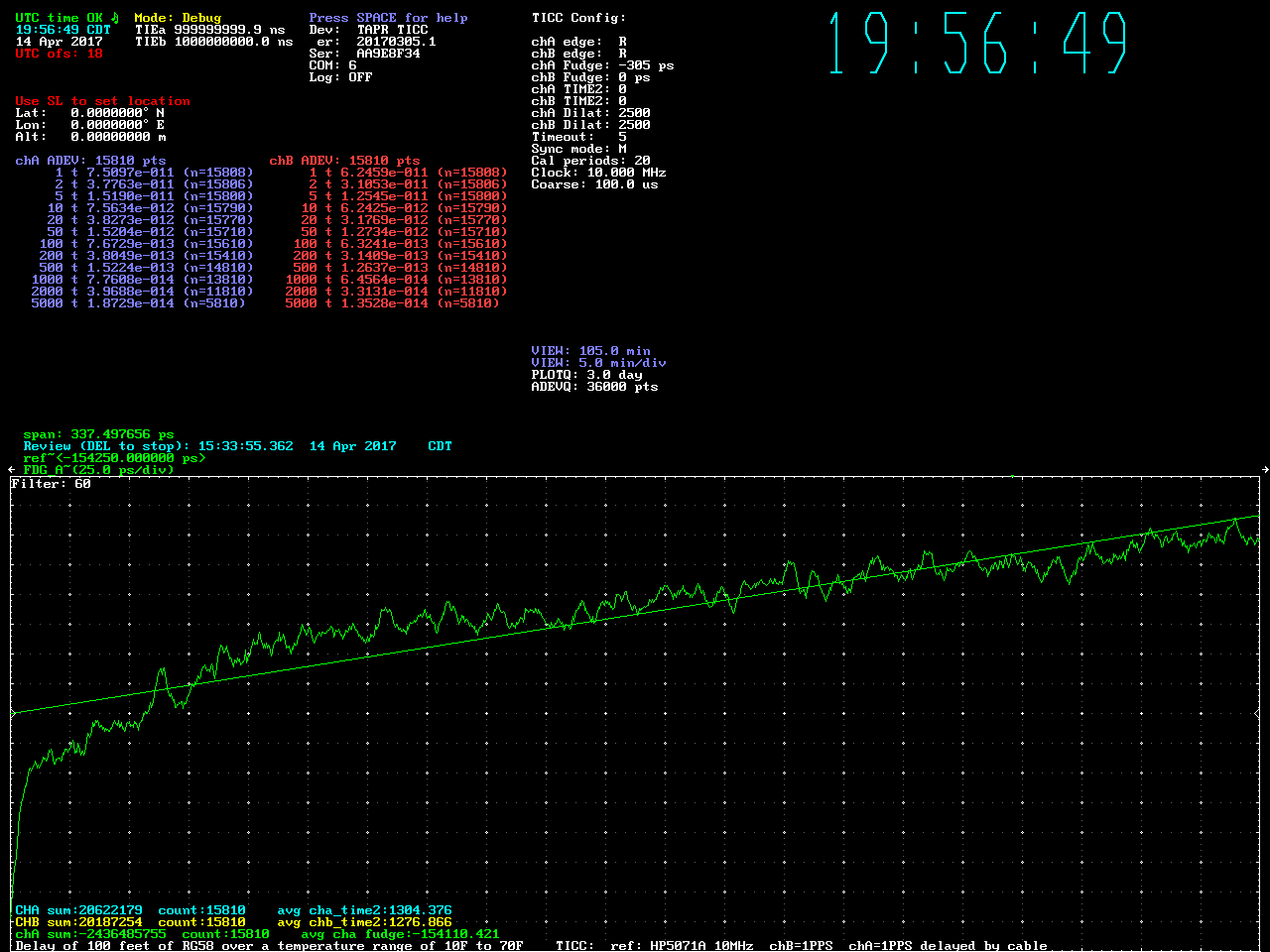 I finally got around to using a TICC to measure the temperature coefficient of 100 feet of generic RG-58 coax using a TICC. The TICC was clocked by a HP 5071A 10 MHz output. The 1PPS output was connected to the input of the coax and the TICC chB input. The TICC chA input was connected to the coax output via an inline terminator. The TICC was set to "debug" mode and Lady Heather plotted the chB-chA timestamp difference (hence the negative cable delay values).
