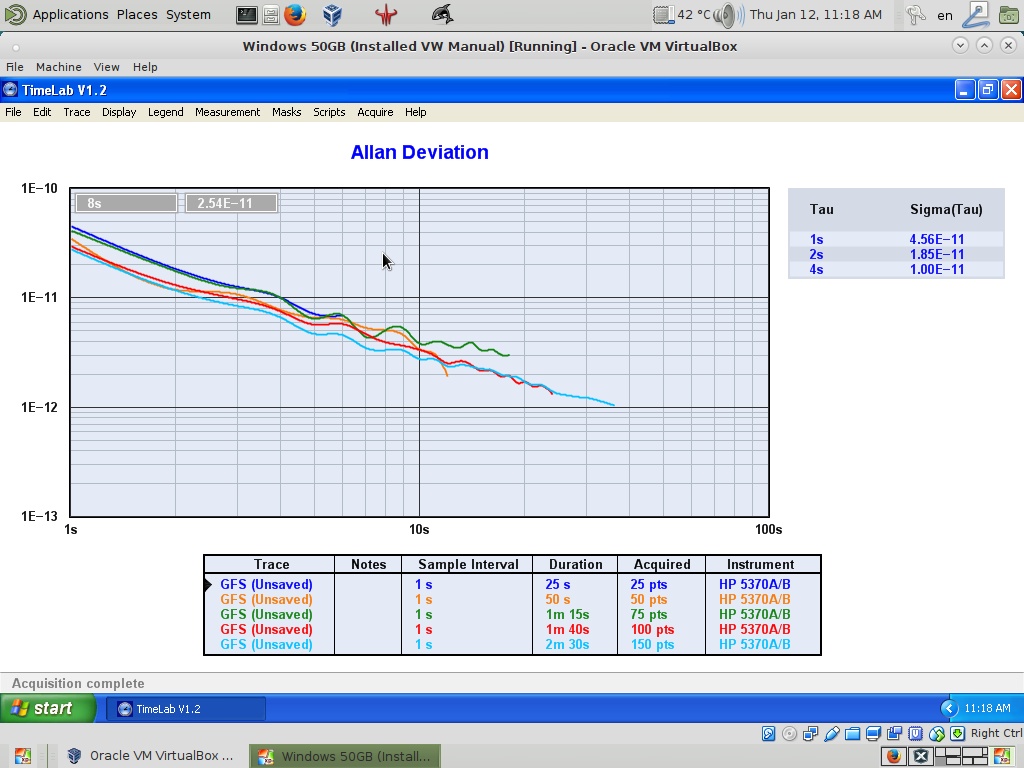 OK, what's a small number of data points? Attached is a screencap of captures for 25, 50, 75, 100, and 150 seconds. Yeah, at 25 seconds, the 1S tau is up at 4.56E-11, but it falls pretty quickly. I will mention that this particular 5370 is much better than my other one. So, maybe this one is an exceptional example?