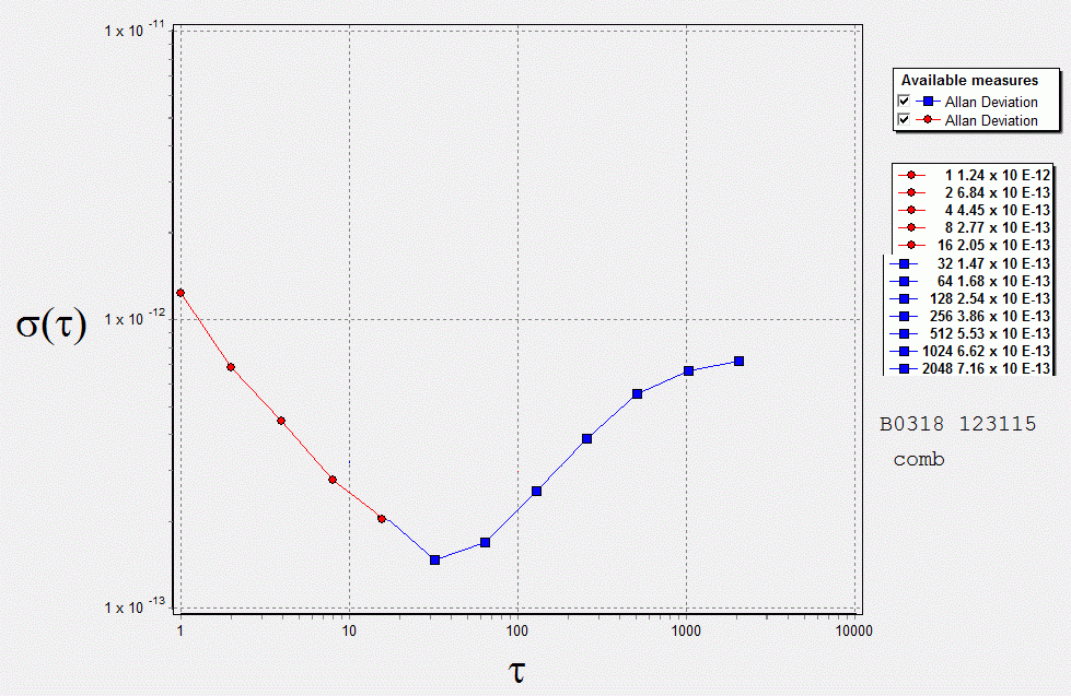 The blue continuation is against a very good HP 5065A (1.5X10-13th at 100