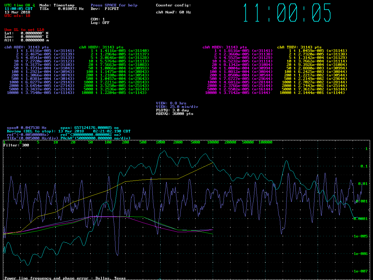 I kludged up a very simple power line interface (3VAC transformer -> 10K resistor -> diode -> PICPET) and fed the (unfiltered) output into a PICPET. The PICPET was clocked using a 10 MHz TTL oscillator. I used Lady Heather to capture and analyze the data. It was measuring the time interval between 60 cycles on the input waveform and calculating the frequency error, phase, and xDEVs.