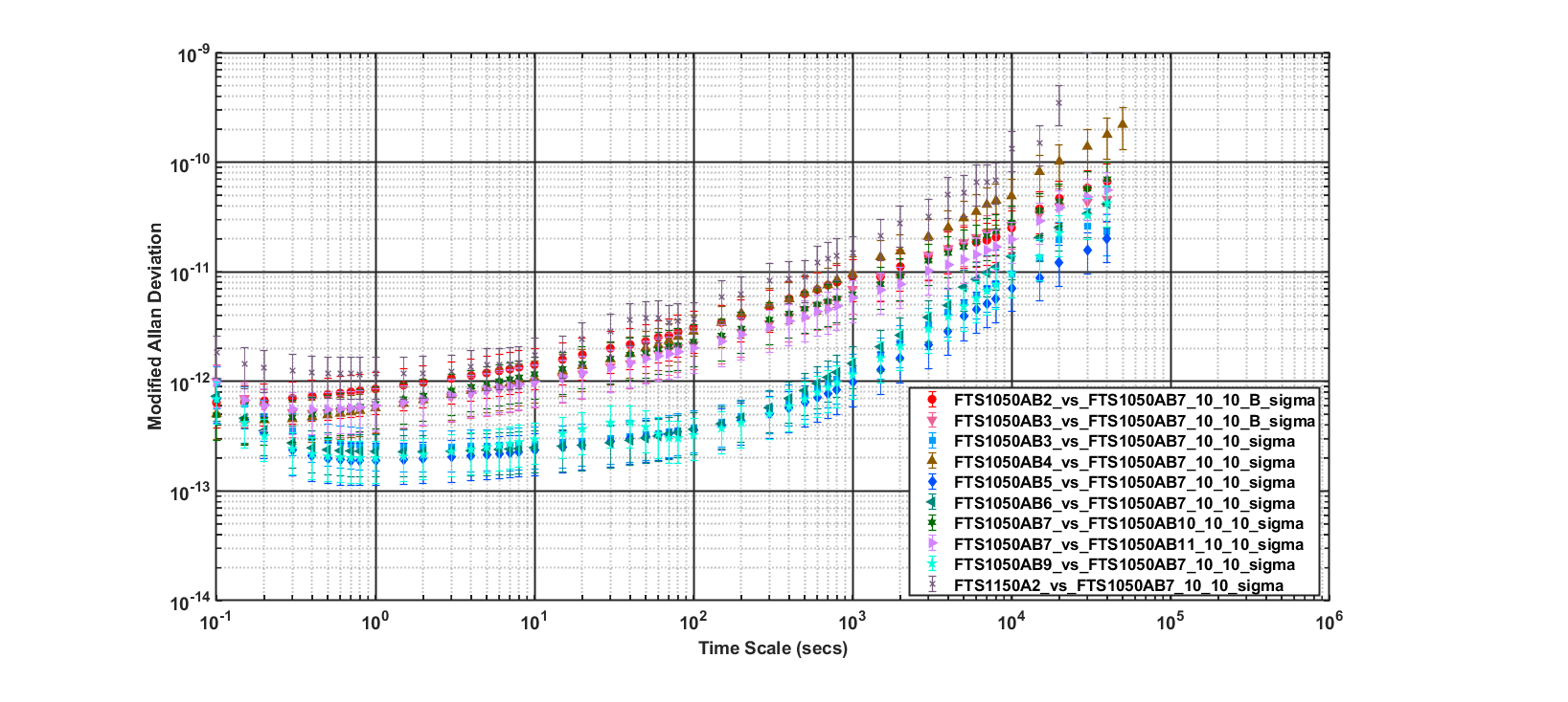 As I mentioned previously, in some 3-day tests one particular FTS1050A (FTS1050AB7 in the plots) performs well (bottom curves) and in other tests it performs somwhat poorly (upper curves). All the comparators in this MADEV plot perform similarly, so there is no obvious reason why there is split into good and bad cases. I have never before seen this behavior.